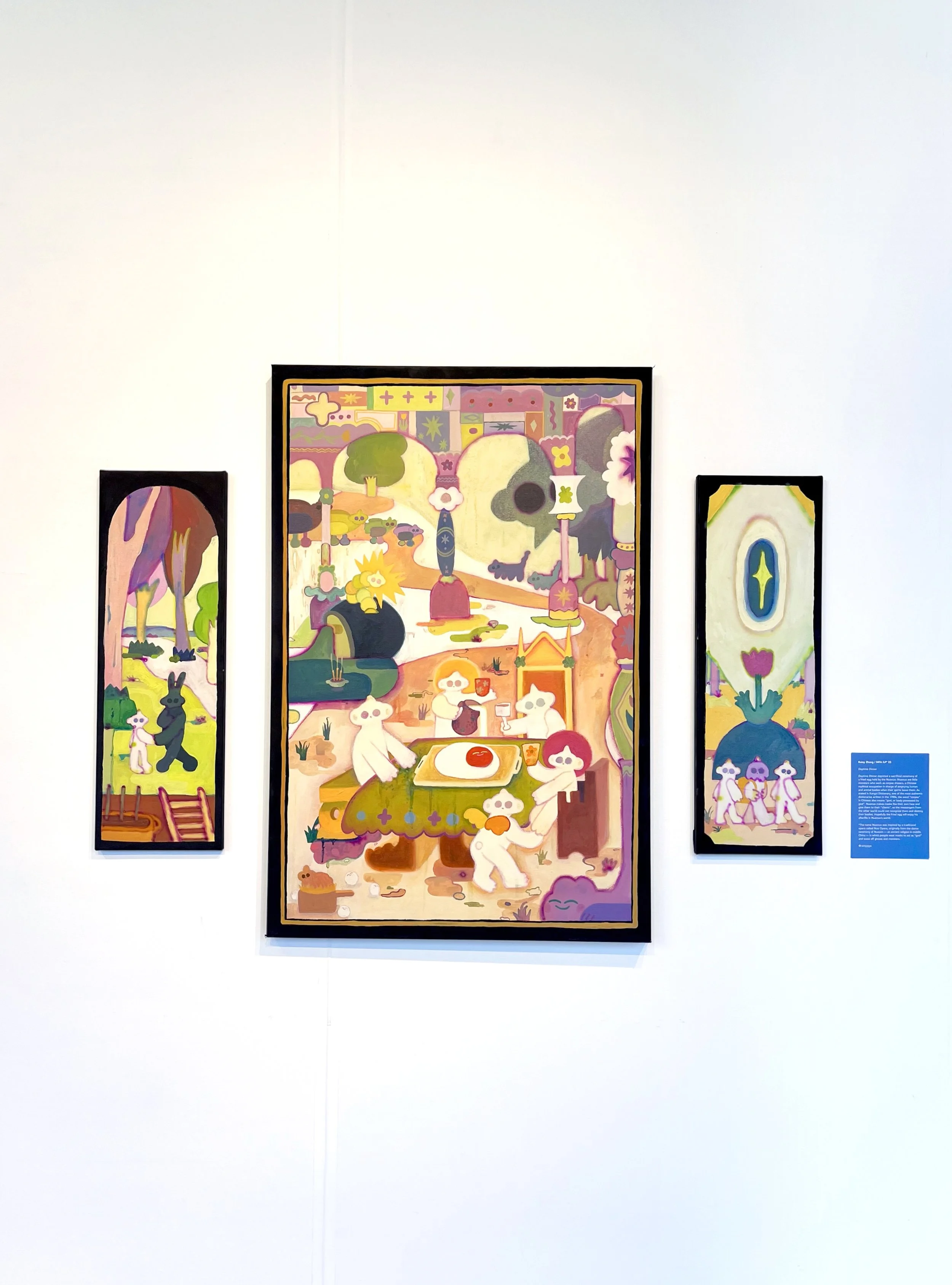 Daytime Dinner depicted a sacrificial ceremony of a fried egg held by the Nuonuo. Nuonuo are little monsters who work as corpse chasers, a Chinese mythical occupation in charge of empty bodies of human beings and animals when their spirits leave them. As stated in Kangxi Dictionary, one of the most authentic dictionaries written in the 1700s, the word “corpse” in Chinese also means “god, or body possessed by god”. Nuonuo make masks like their own face and give them to their “clients”, so the messengers from the other world could not recognize them and destroy their bodies. Hopefully the fried egg will enjoy his afterlife in Nuonuo’s world.